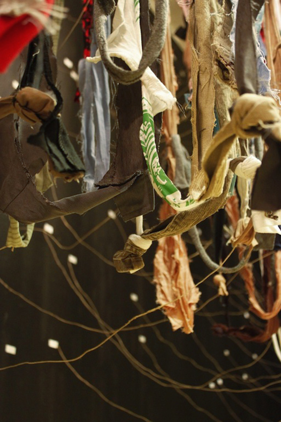 The subject is so loaded with layers of meaning that leads the dialogue with viewers. The clothing is all equal due to “deconstructing” and all differences are surmounted. Different kind of clothes snipped and tore apart and tied in a shape of rope and hanged from the ceiling. the color and material of the clothes is a kind of assimilation of shapes and style to imagine the clothes and this is a sort of brains analyzing to understand and find similarities from past information in mind. This is same when we met new people and we try to know about their personality. Coordinating the feelings and sensation to identify personalities.