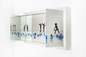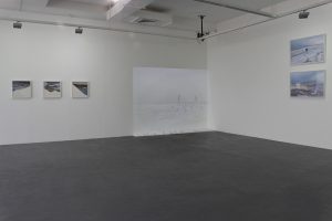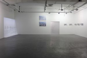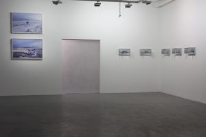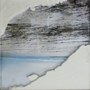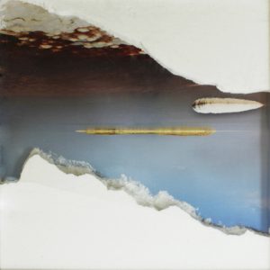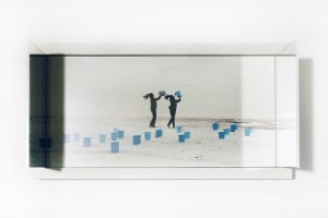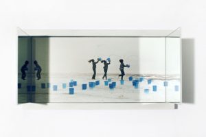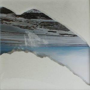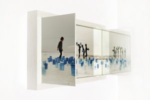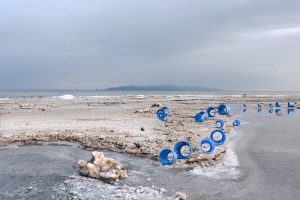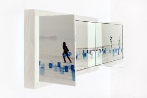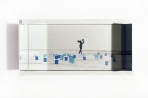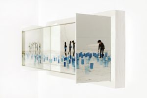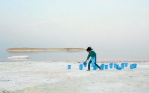 This series depicts photographs of the artist dumping bottomless buckets of water into the lake in attempt to reverse that trend as well as landscape photographs displayed in glass boxes containing salt. The artist appears as an individual confronted with realities larger than herself as she futilely attempts to resuscitate life. Nonetheless, Zarfsaz’s initiative demands that humans be held responsibile to the environment and other species in the global community. The salt-filled cases, by which the works resemble hourglasses, maintain the immediacy of time and the pressures of acting against the clock—i.e., before death overtakes life.