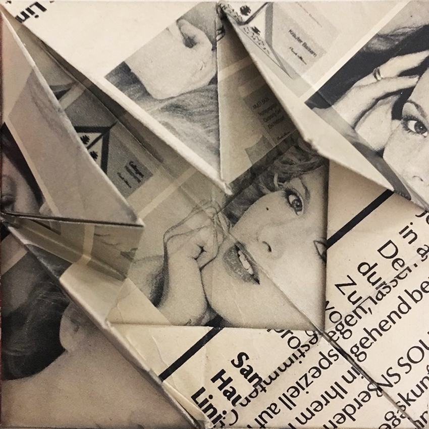 a new meaning for an image by putting it in a new context. She found it more interesting to fold images instead of cutting these photos which gives the composition a relief quality, also utilizing the texts and letters in a way that they become images rather than text. She assumes that this folding technique is quite important because there will be an image on the backside that you can not see, a hidden image or maybe a secret message. The matter of what we can make that is replaced by how we make do with what we have and the starting point from virgin materials faded in the creating meaning in the innumerable flows of productions.